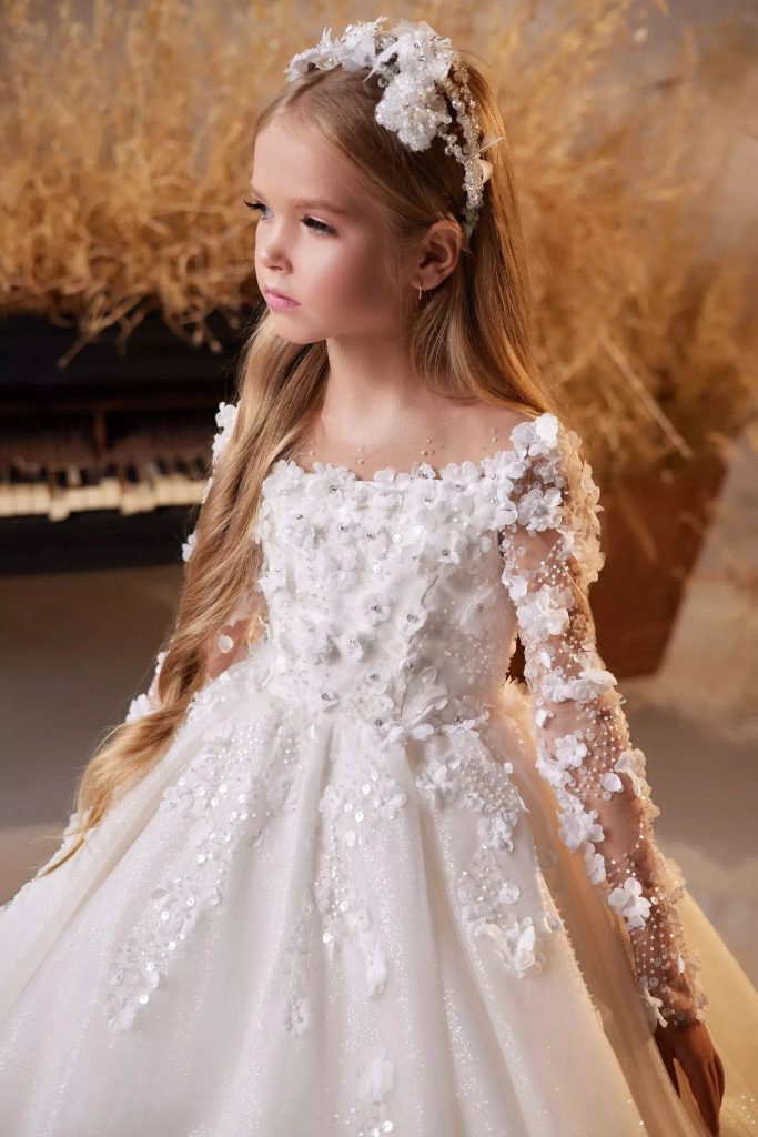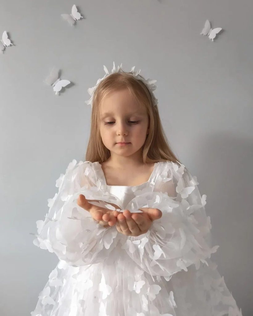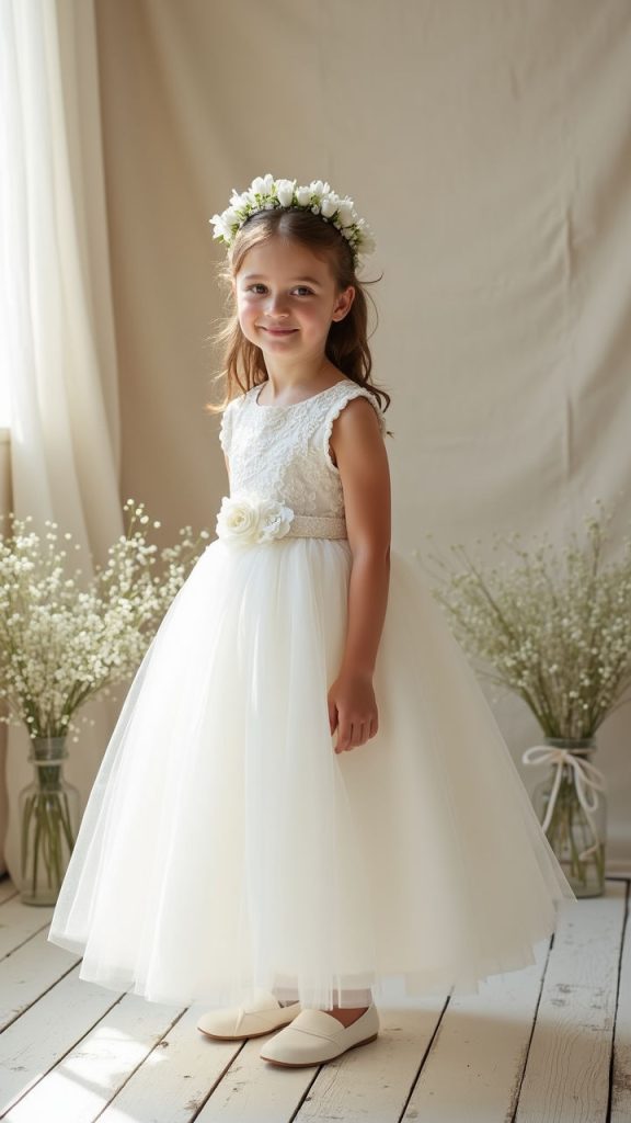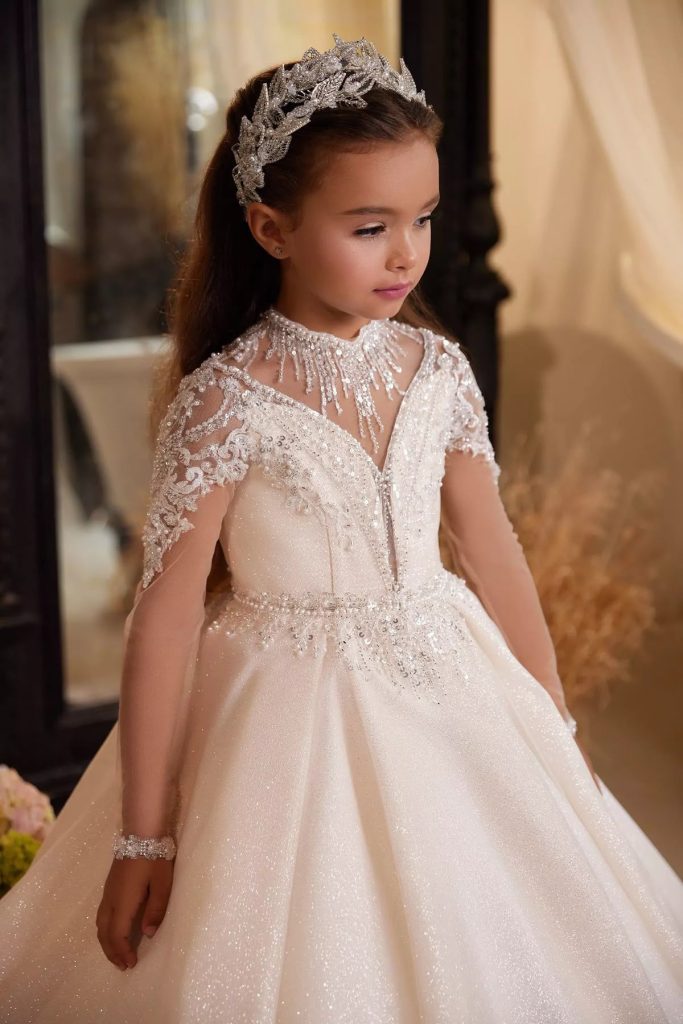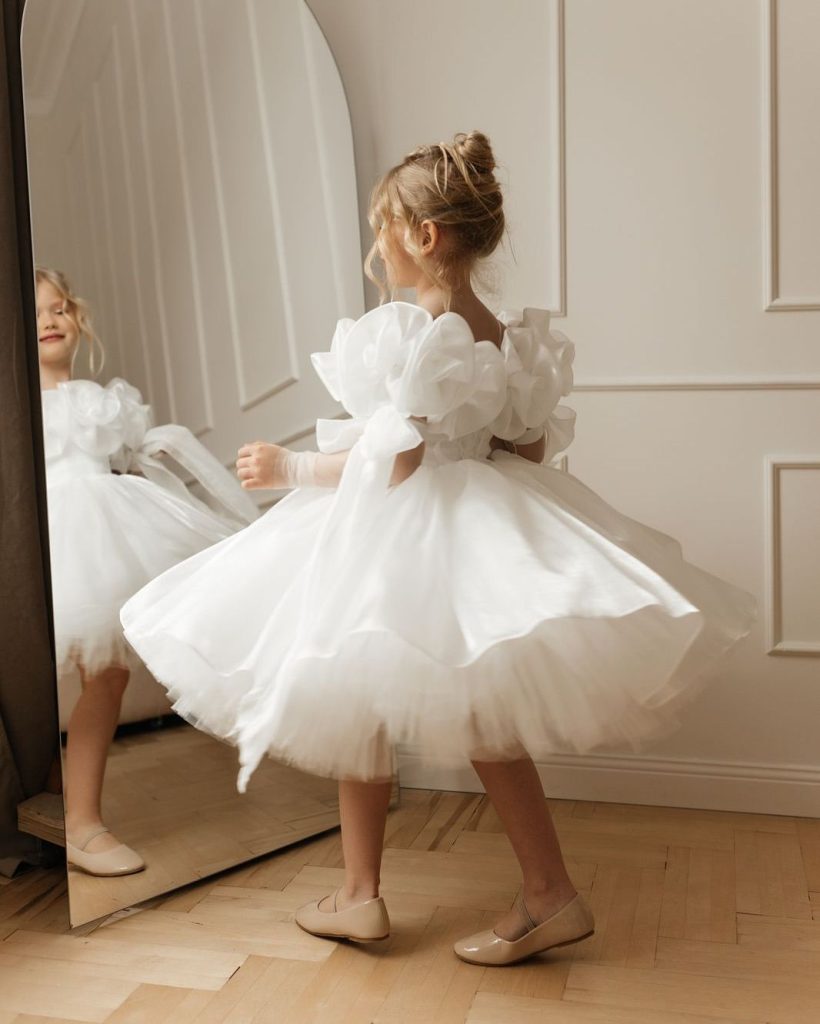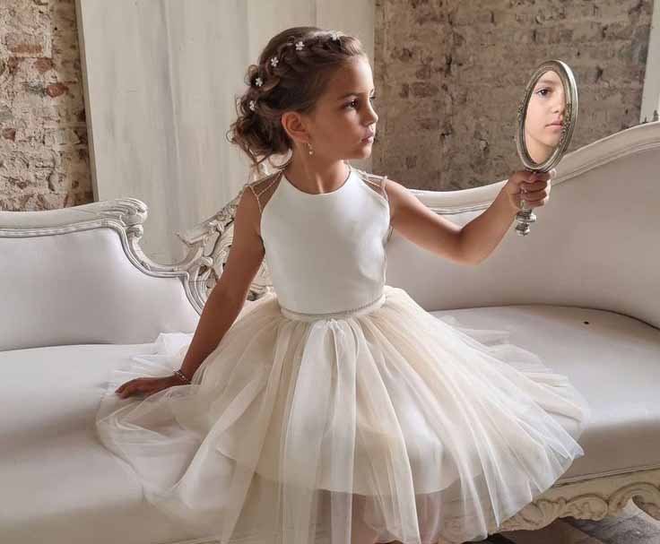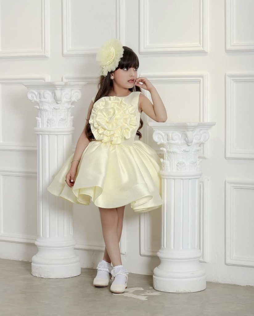 - پفی سبک (Ballgown ملایم): برای مراسم شب و عکسهای رسمی؛ حجم دامن کنترلشده تا کودک خسته نشود.