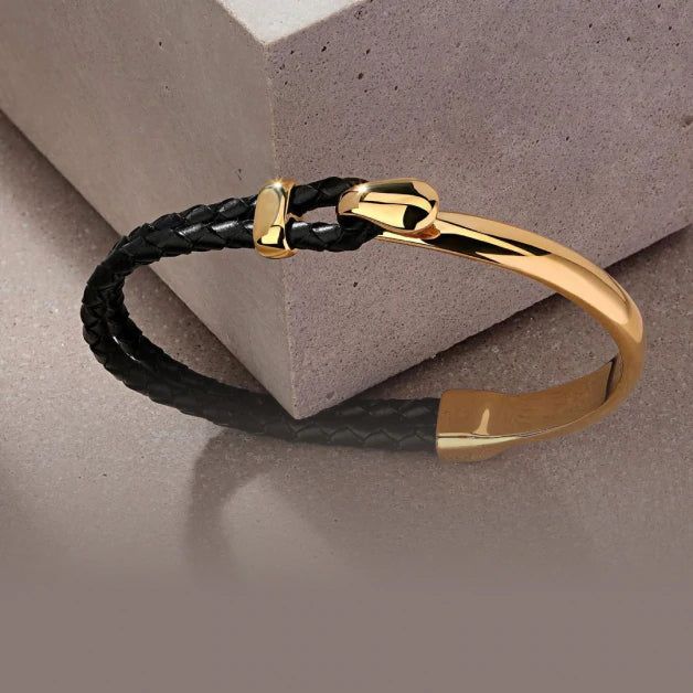 اجزا: بند چرمی (دانهریز/صاف) + قطعات طلا (پل، بَکِل یا موتیف مرکزی). حس ظاهری: گرم و روزمرهٔ شیک؛ عالی برای اسمارتکژوال. نکته فنی: مراقبت از چرم (دوری از رطوبت زیاد)، انتخاب یراق ضدحساسیت.